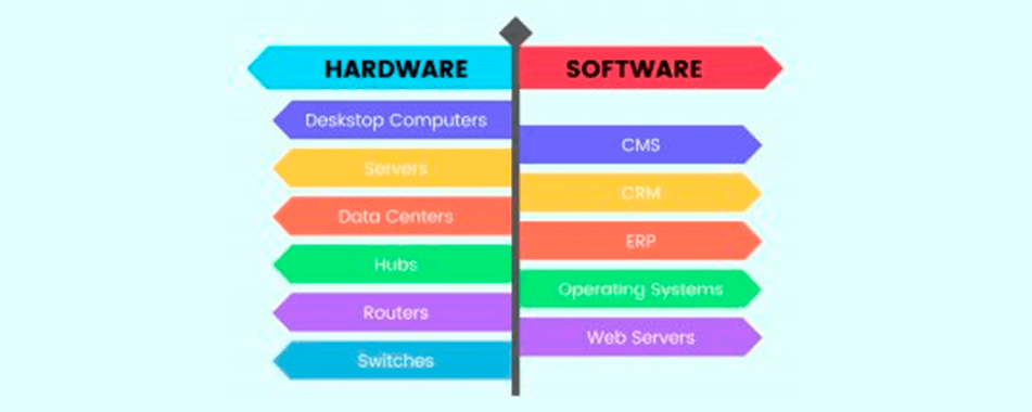 The two core groups of components, hardware and software and the interdependent elements together all formed a complete set of IT infrastructure.